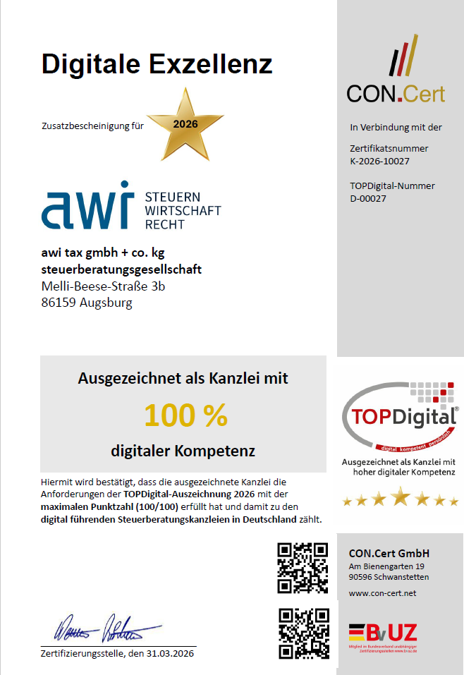 Auch in diesem Jahr hat sich unsere Augsburger Kanzlei erfolgreich den umfangreichen Anforderungen des Audits gestellt und dabei die maximale Punktzahl von 100/100 erreicht. Das Zertifikat bestätigt unsere hohe digitale Kompetenz sowie unseren ausgeprägten Erfahrungsgrad in den Bereichen IT-Infrastruktur, Softwarelösungen, Softwareanwendung, Personal, Strategie & Organisation sowie IT-Risikomanagement.