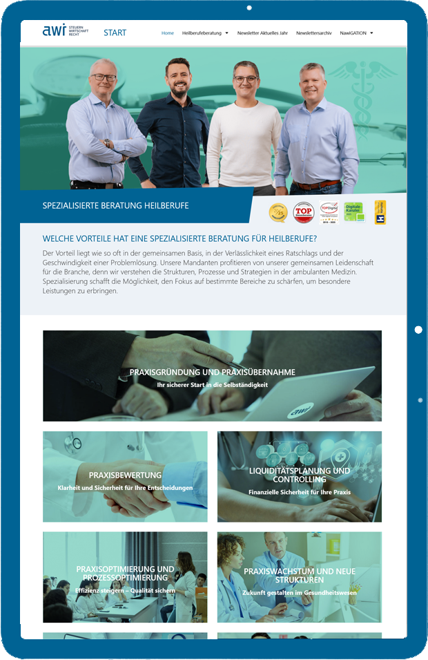 So können Ärzte, Psychotherapeuten oder Physiotherapeuten nicht freizügig Patienten behandeln, Honorare vereinnahmen, beliebig Preise festsetzen oder Kooperationen eingehen. Deswegen ist es für Sie als Angehöriger eines Heilberufs wichtig, jemanden an Ihrer Seite zu haben, der genaue Kenntnisse über die verschiedenen Regelungen hat. awi bietet Ihnen extra geschultes Personal, das auf Heilberufe spezialisiert ist. Profitieren Sie von unserer jahrelangen Erfahrung und lassen Sie sich zum Thema Heilberufe beraten.